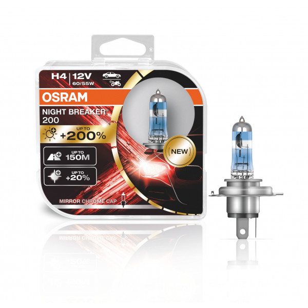 Patirkite kita automobiliu apšvietimo lygi: naudodami ryškiausia OSRAM halogenini automobilio lempute „NIGHT BREAKER 200“. Ši modernii priekiniu ˛ibintu ;empute, lyginant su istatymu nustatytu minimaliu standartu, turi šviesos net iki 200% didesnio ryškumo, iki 150 m ilgio ir 20% baltesnes šviesos kugio.